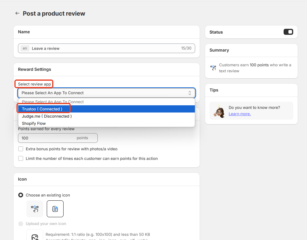 In the "Select review app" dropdown menu, choose "Trustoo".