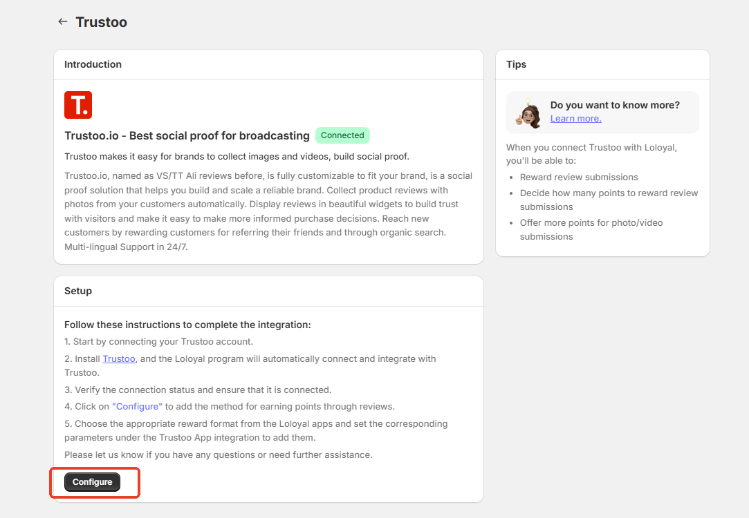 Your Loloyal and Trustoo accounts are now integrated! You can now customize your points system directly on the current page.